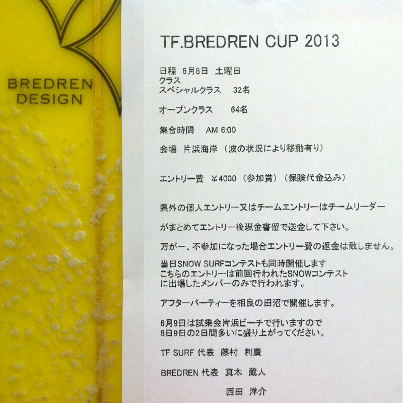 マジックツインスタビライザー、ローエッグ等、今まで数々の名ボードを生みだしてきた真木蔵人率いる「BREDREN DESIGN(ブレドレンデザイン)」のシェーパーである静岡のTFサーフの藤村氏のもとで、この度「TF. BREDREN CUP」が開催されます。